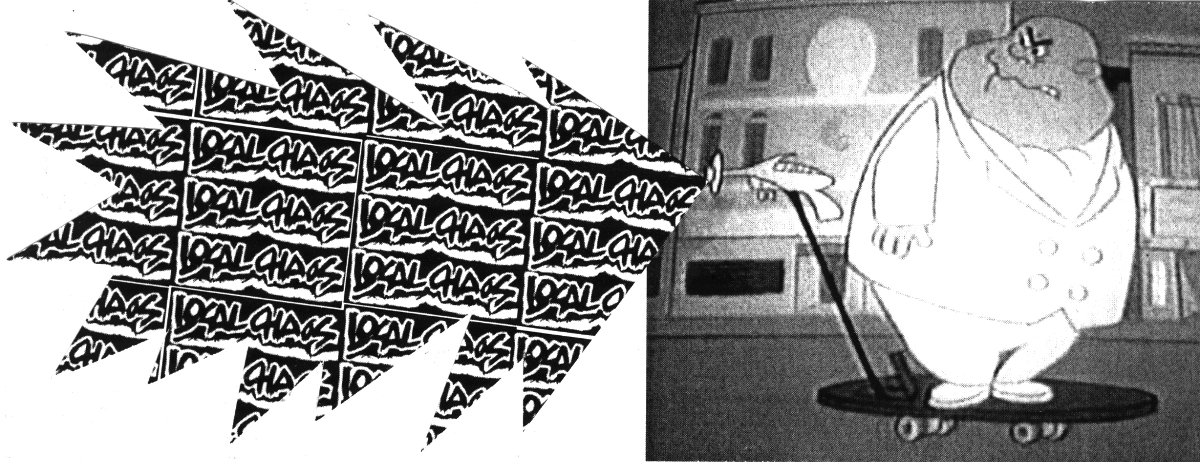 LocalCHAOS, the skate zine, could have never happened if it were not for all my bros I skated with back in the day. Mike Bush, Tony Custodio, David Tuck(RIP), Jeff Martin, Todd Philipps(RIP), Rick Osbourne, Trevor Staples, Martin Friedman(RIP), Adam Graham, Lee Jackson, Tommy Hartwell, Derick and Davy Robbins, Mark Hildinger, Rob Dahl(RIP), Ken Nelson, Chris Becker, Kip Griffin, Jon Wright, Kevin Ryberg(RIP), Marc Conahan (Body Slam 'zine), Poacher, Phil (cool roller skater dude), Mint, Al Carter(RIP)(Rebel Ramp - Georgetown, S.C.), Rick Tertel, Kyle MacDonald, Andy MacDonald and my very special bro of bros...Jeff Hadley(RIP) - Keeper of our Vert Ramp and provider of MANY MANY very cool memories. To you Jeff, I raise my 40 and toast.